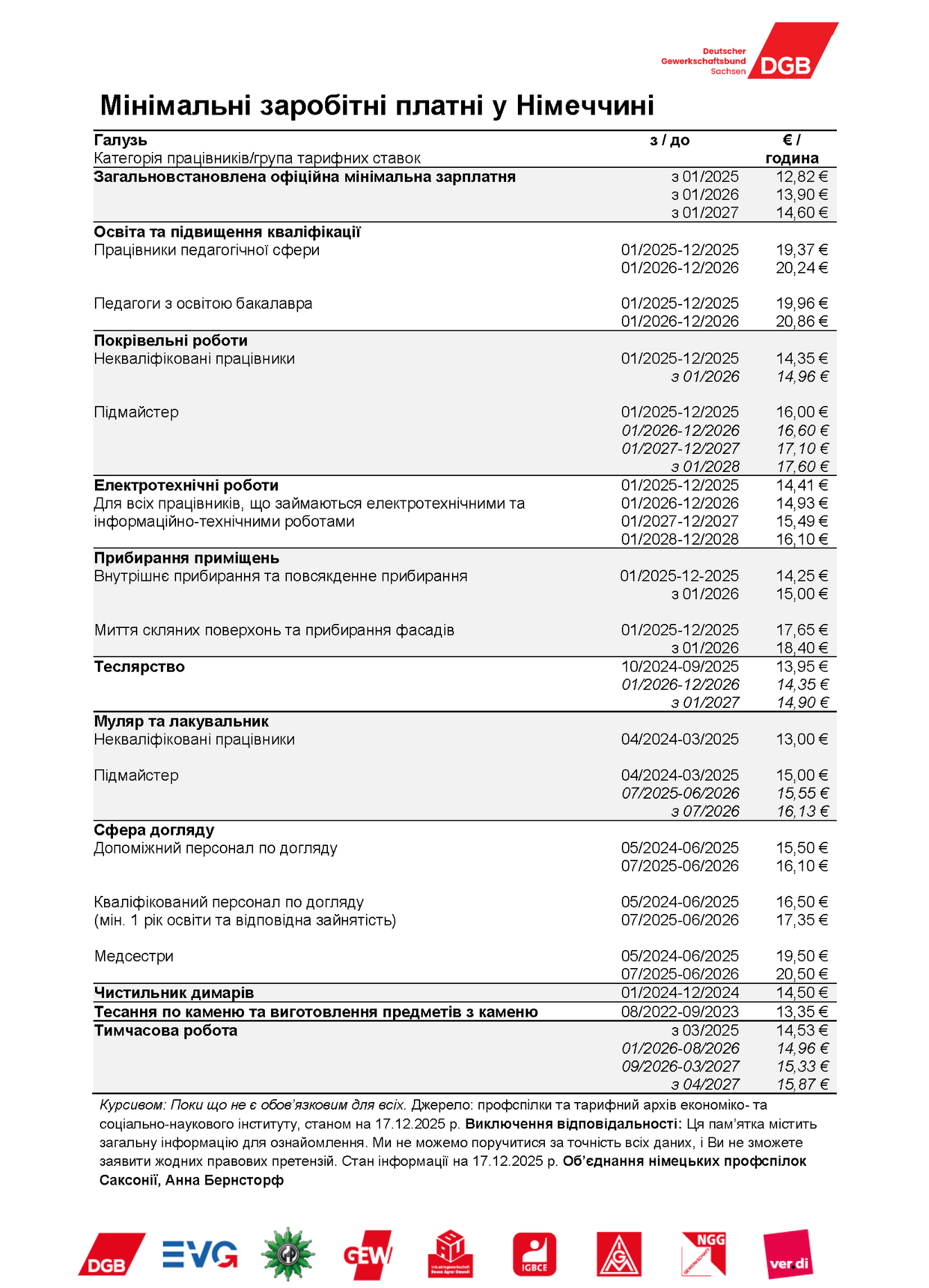 На данный момент он составляет 12,82 евро/трудовой час. С 1.1.2026 г. ставка поднимается до 13,90 евро/трудовой час. С 1.1.2027 г. ставка поднимается до 14,60 евро/трудовой час.