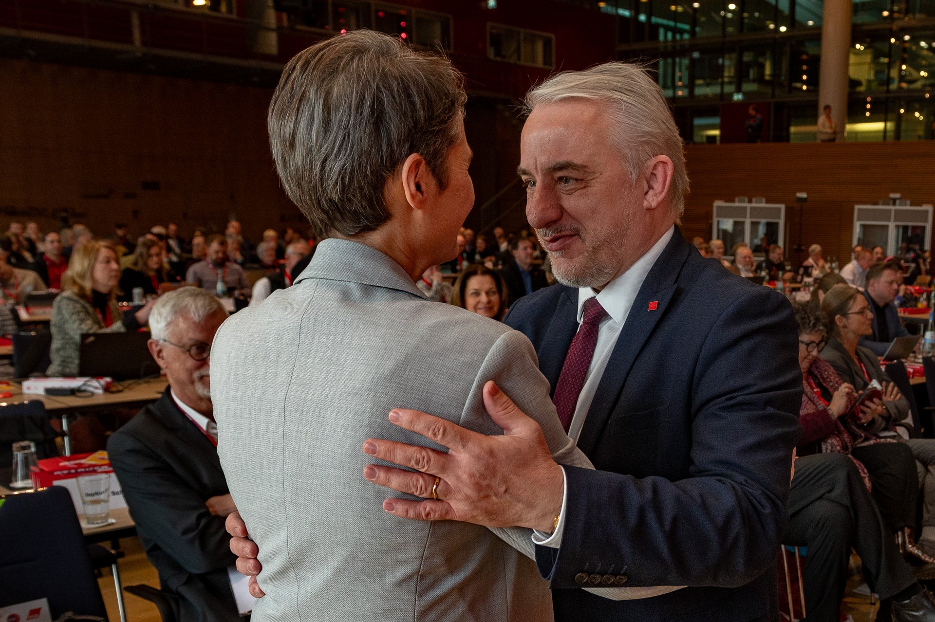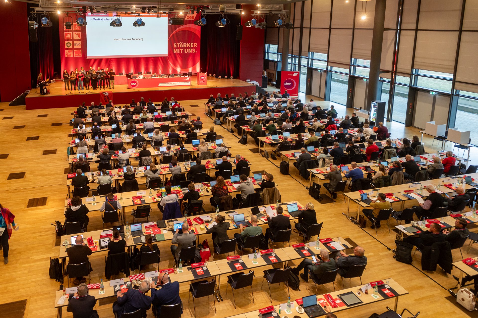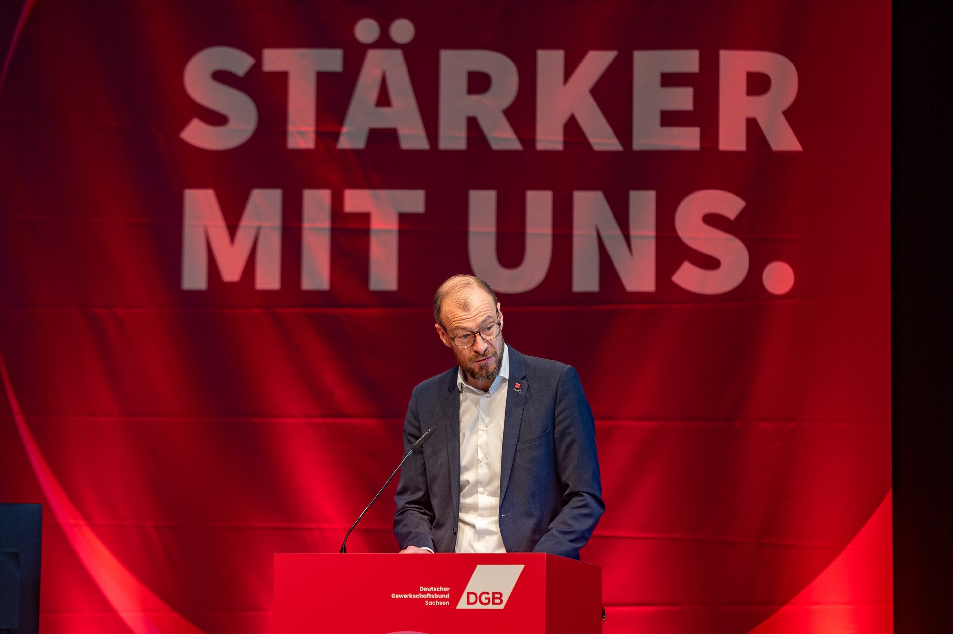 Unter dem Motto „Stärker mit uns“ fand am 24.01.2026 unsere 10. Ordentliche Bezirkskonferenz des DGB Sachsen in Dresden statt. Auf dem Programm stand die Wahl der/s Vorsitzenden, der/s stellvertretenden Vorsitzenden des DGB Sachsen, sowie der vier DGB-Regionsgeschäftsführer*innen in Sachsen. Ebenfalls auf dem Programm standen Grußworte von Ministerpräsident Michael Kretschmer, Oberbürgermeister Dirk Hilbert und unserer DGB-Bundesvorsitzenden Yasmin Fahimi. Nach den Wahlen haben die rund 100 Delegierten aus unseren acht Mitgliedsgewerkschaften 24 Anträge und eine Resolution diskutiert und verabschiedet.