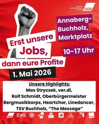 Am Tag der Arbeit gehen wir in Annaberg-Buchholz auf den Marktplatz! In Zeiten von Umbrüchen und Unsicherheit zeigen wir: Wir sind viele, wir sind laut und wir stehen füreinander ein. Egal ob im Büro, in der Produktion oder im Homeoffice – gute Arbeit gibt es nur mit uns!